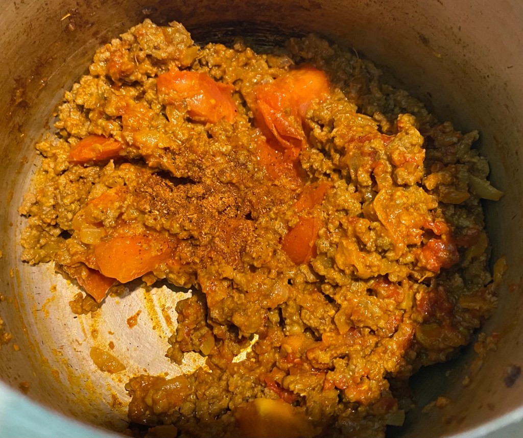 - Put in turmeric, paprika, red chili powder, cumin powder and coriander powder. When the masala is fried with the meat, add tomato purée and chopped tomato. Sauté till the tomatoes cook into the meat and the masala starts to leave the sides of the pan.
