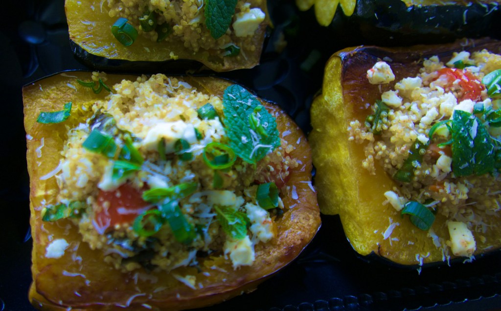 - Divide the quinoa mixture into the squash halves. Top with crumbled feta. Put the squash back in the oven for 15 minutes till the cheese melts. Serve with freshly grated Parmesan and some basil and mint leaves.
