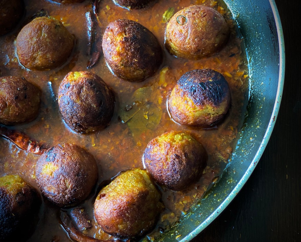 Green banana can be a main ingredient in a kofta, you ask? Yep, only Bengals can come up with dishes like this. Green banana with mashed potato and spices from an Indian kitchen works its magic in this easy but slightly unusual recipe. If you’re a Bengali its not unusual at all. Almost anything and everything has been made into koftas, curries, kebabs and the fun part is, it is always delicious! This is a family favorite in our household too especially because I make it in special occasions. This is a slightly healthier recipe than the traditional way of frying the kofta. I used my ebelskiver pan to use minimal oil but you can definitely deep fry them too @sarchakra