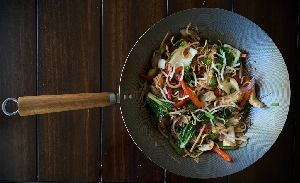 - Heat 1 tbsp oil. Sauté garlic and onion. Add mushrooms, red bell pepper, green bell pepper, ginger and keep stirring on high heat. Add the rice noodles.