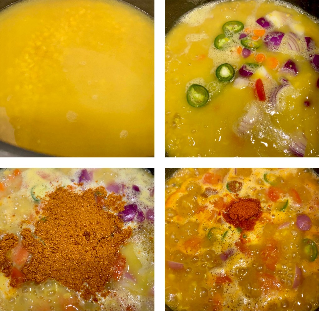 - Rinse dal. Cook in the pressure cooker with 3 cups of water with salt and turmeric. Let the pressure release by itself.