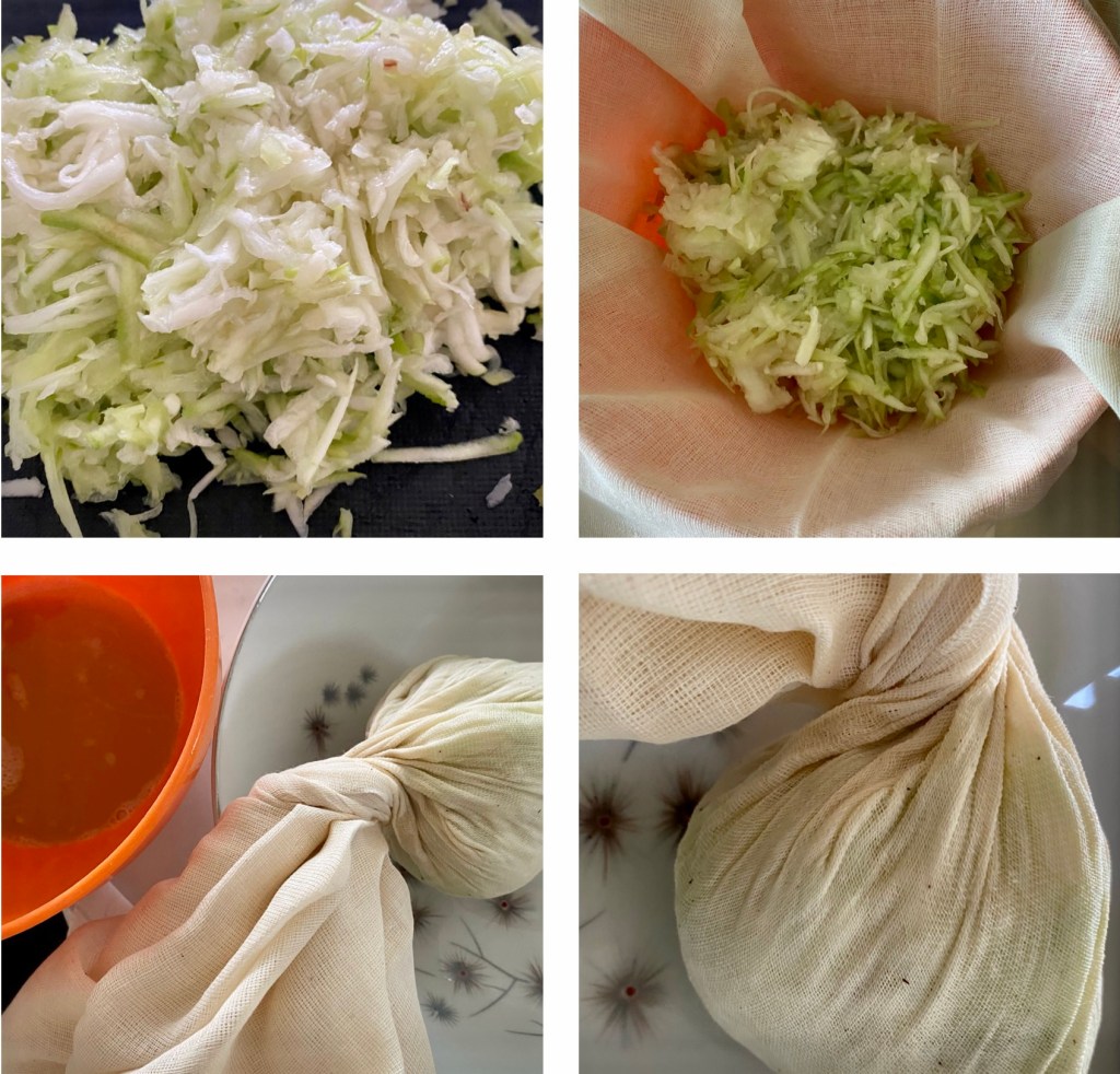 - Grate lauki. Using a cheesecloth squeeze out the extra liquid. Reserve the water.