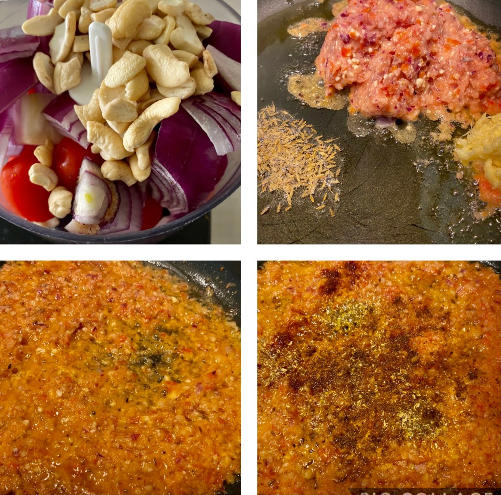 - In a blender put in chopped onion, cashews and cherry tomatoes. Blitz into a paste without adding any water. Keep aside.