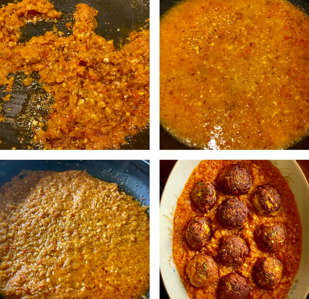 - Add 1 cup of water, bring to a boil. Turn the heat down, cover and cook. Gently add the koftas into the pan and keep it covered for a minute.