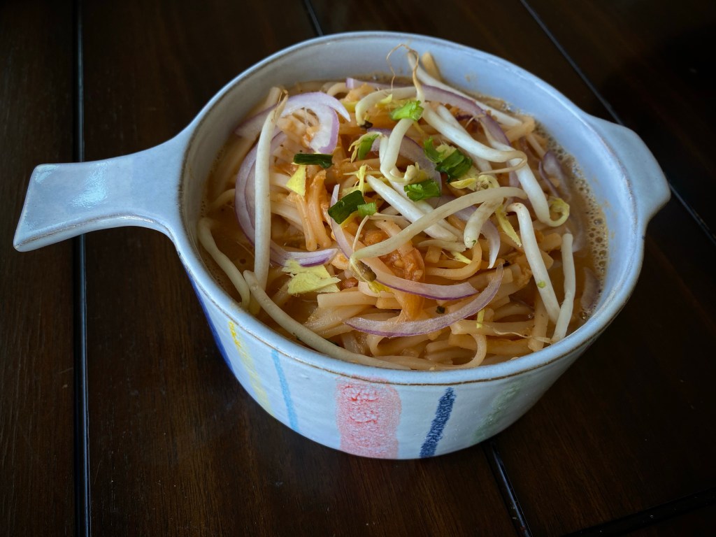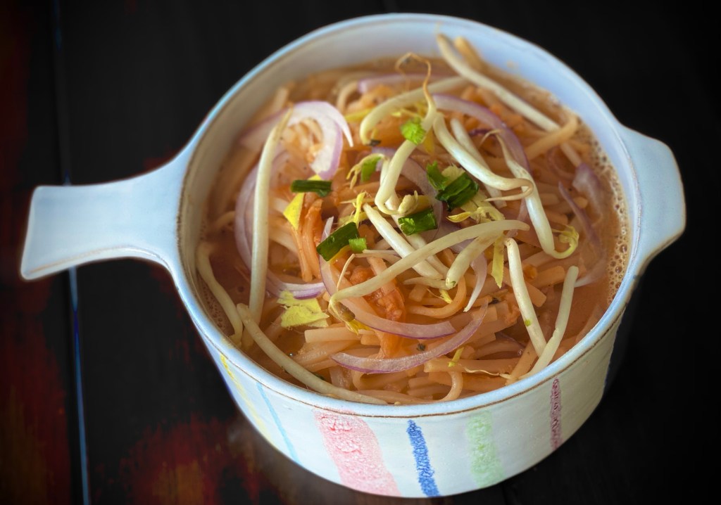 - Garnish the soup with bean sprouts, chives and the rest of the onion slices.