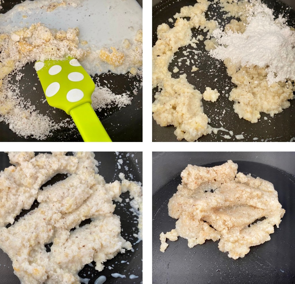 - In a heavy bottomed pan cook mawa for 3-4 mins. Add sweetened coconut along with milk, green cardamom powder and camphor. Add confectioners sugar.
