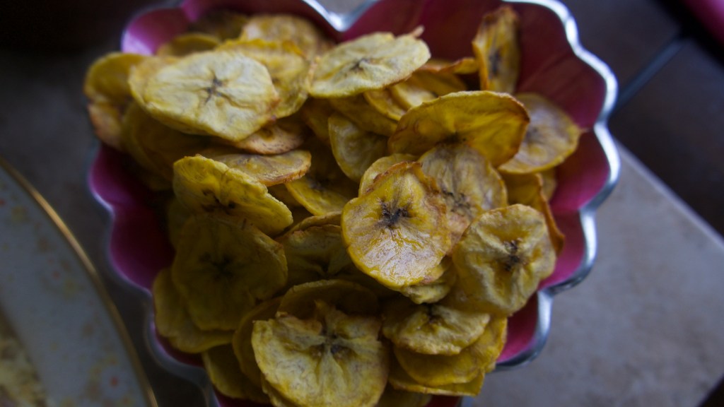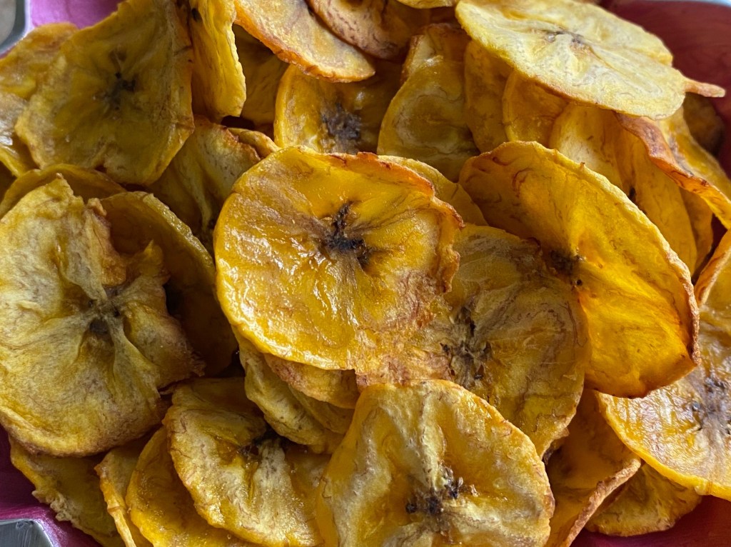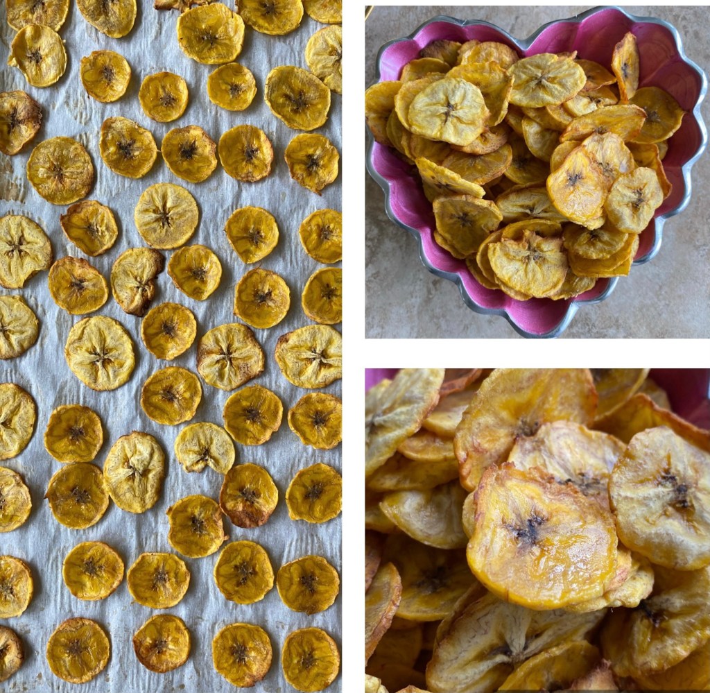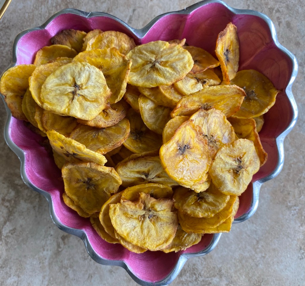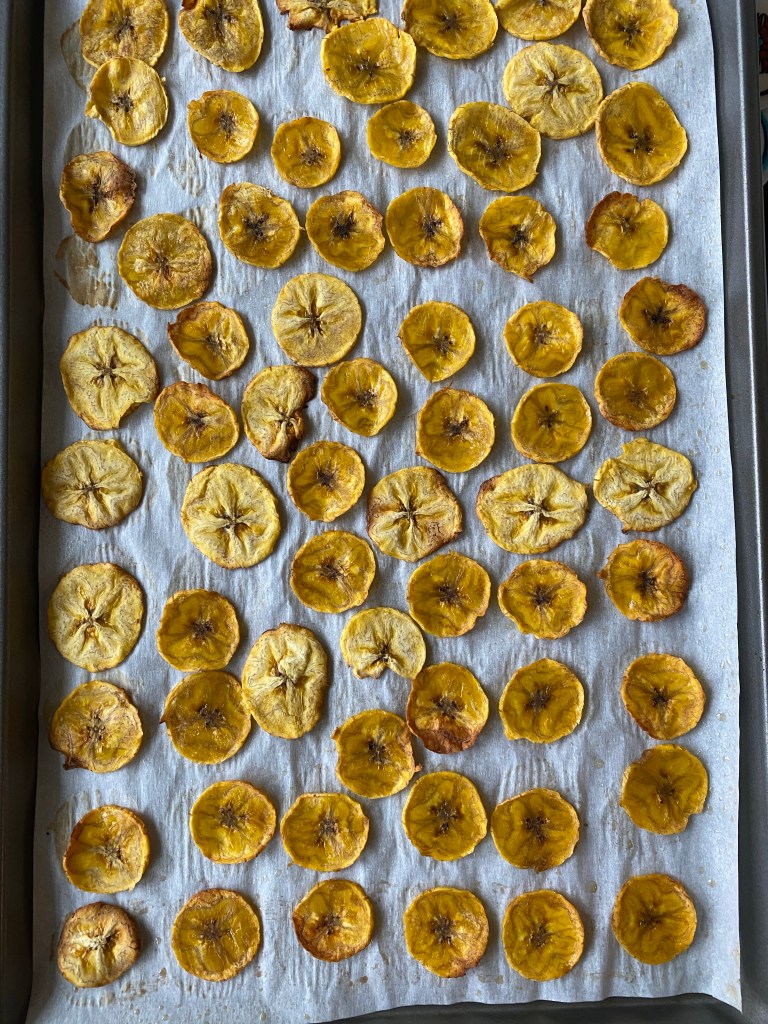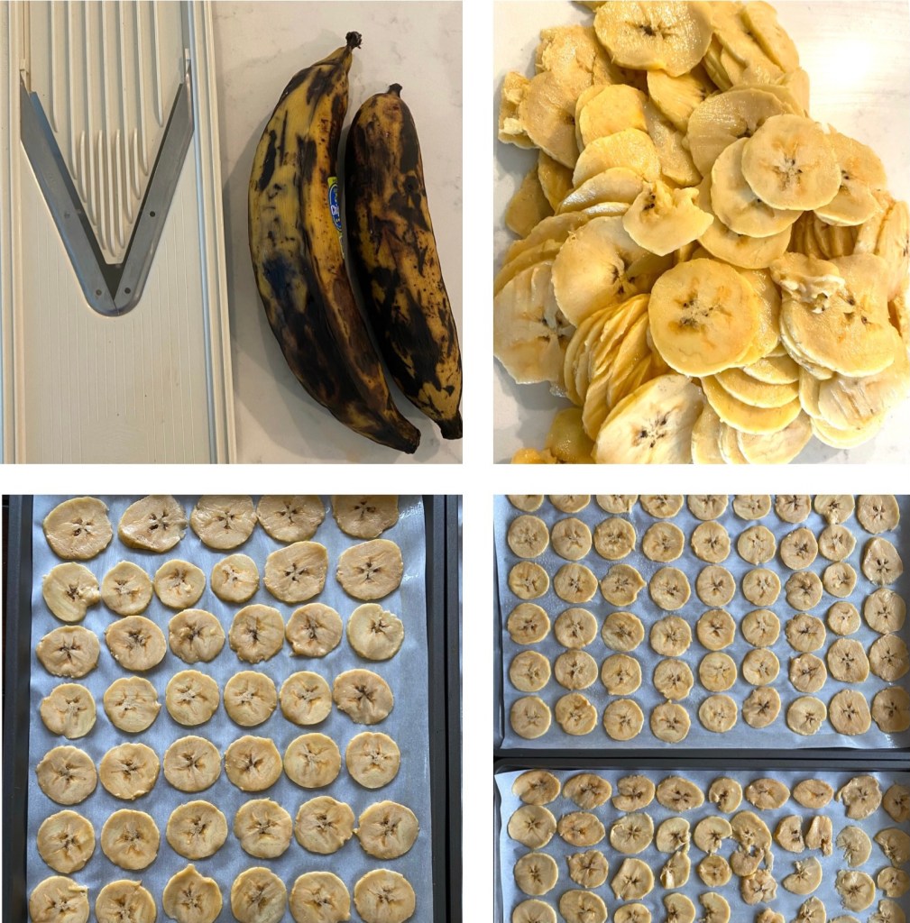 - Take the plantain peel off. Using a mandolin slicer make thin slices of the plantain.