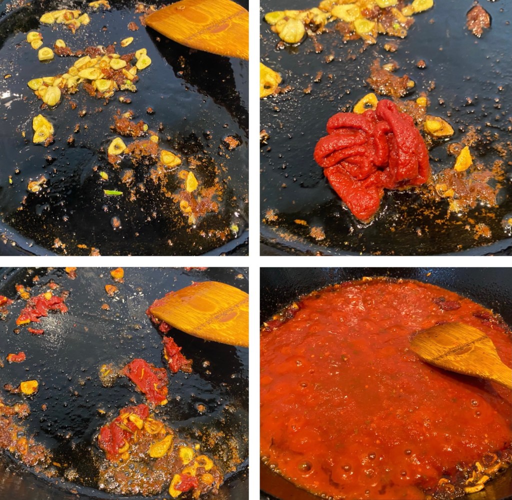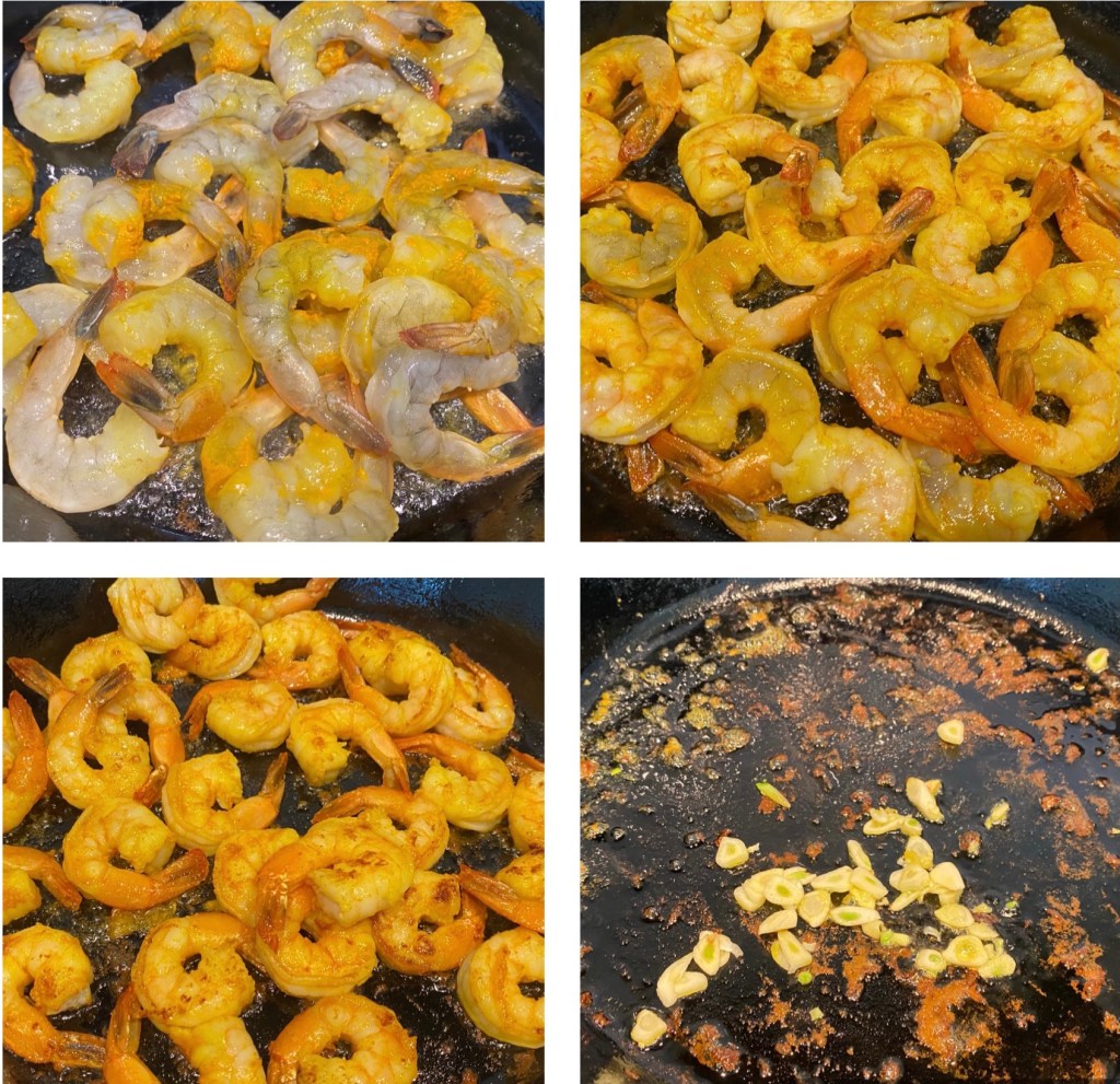 - In the same oil put in garlic. Scrape the pan and mix into the garlic all that ‘prawn’ flavor. Let the garlic start to turn golden.