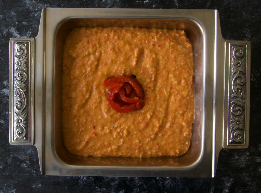 - Pour hummus in a serving bowl. Top with the remaining strips of roasted red pepper slices. Serve with pita bread.