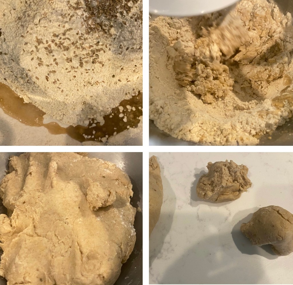- In a stand mixer put in all the flours, carom seeds, salt and vegetable oil.