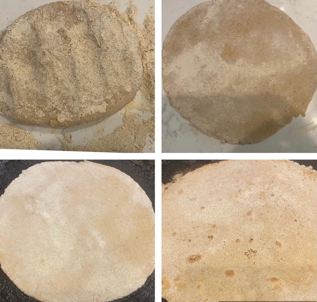 - Take a portion and dust with some chick pea flour. Use a rolling pin to form a round circle.