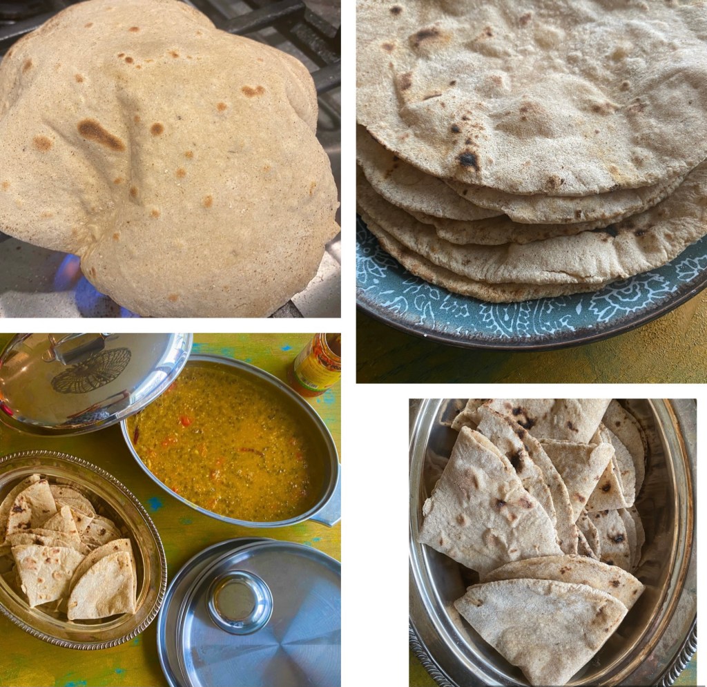 - Heat a flat griddle or pan. Dust off any leftover chick pea flour and roast the chapati on both sides. Using a tong put the chapati directly on the fire and cook both sides till it puffs up. Repeat for the rest of the dough portions.