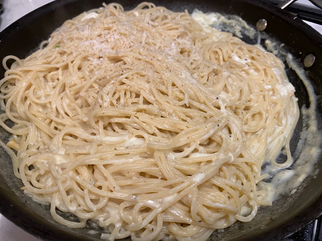 - Put cooked linguini in. Add in mozzarella and grated Parmesan.