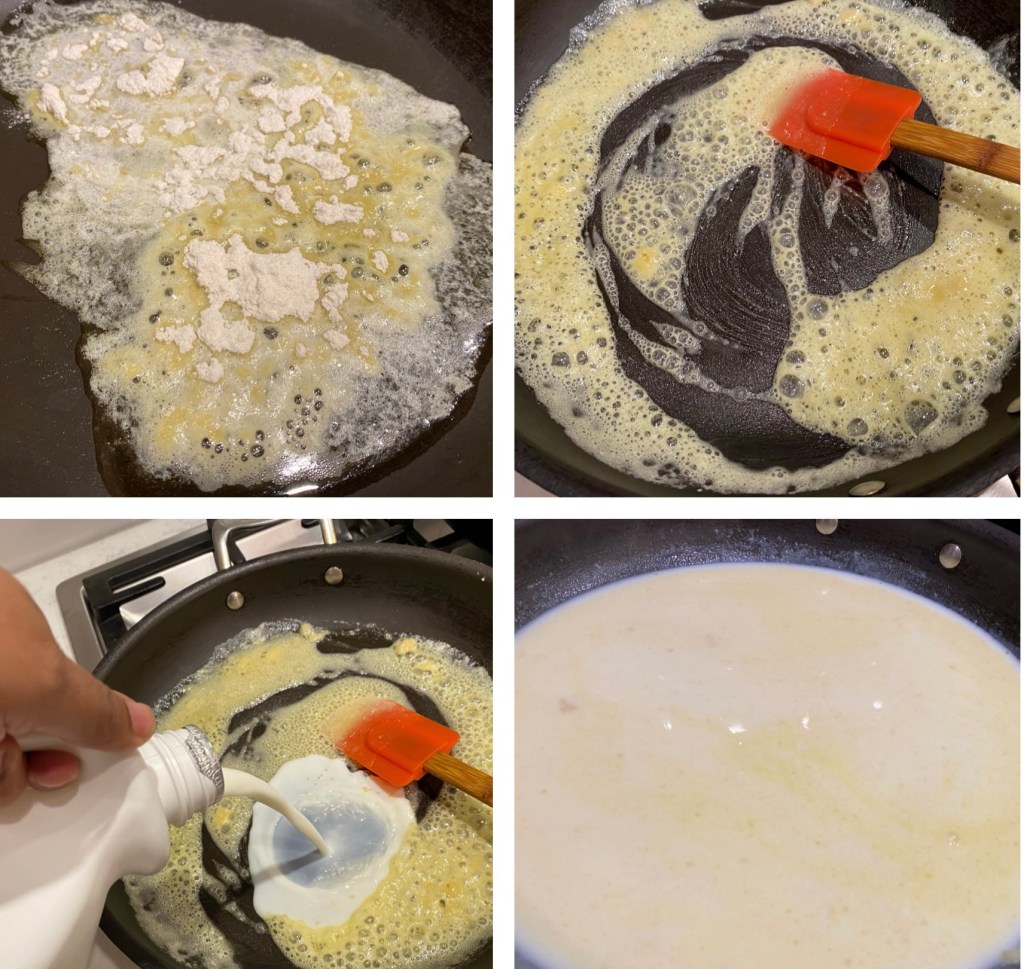 - Add the milk little by little constantly stirring to make sure no lumps remain. The end result should be smooth and creamy.