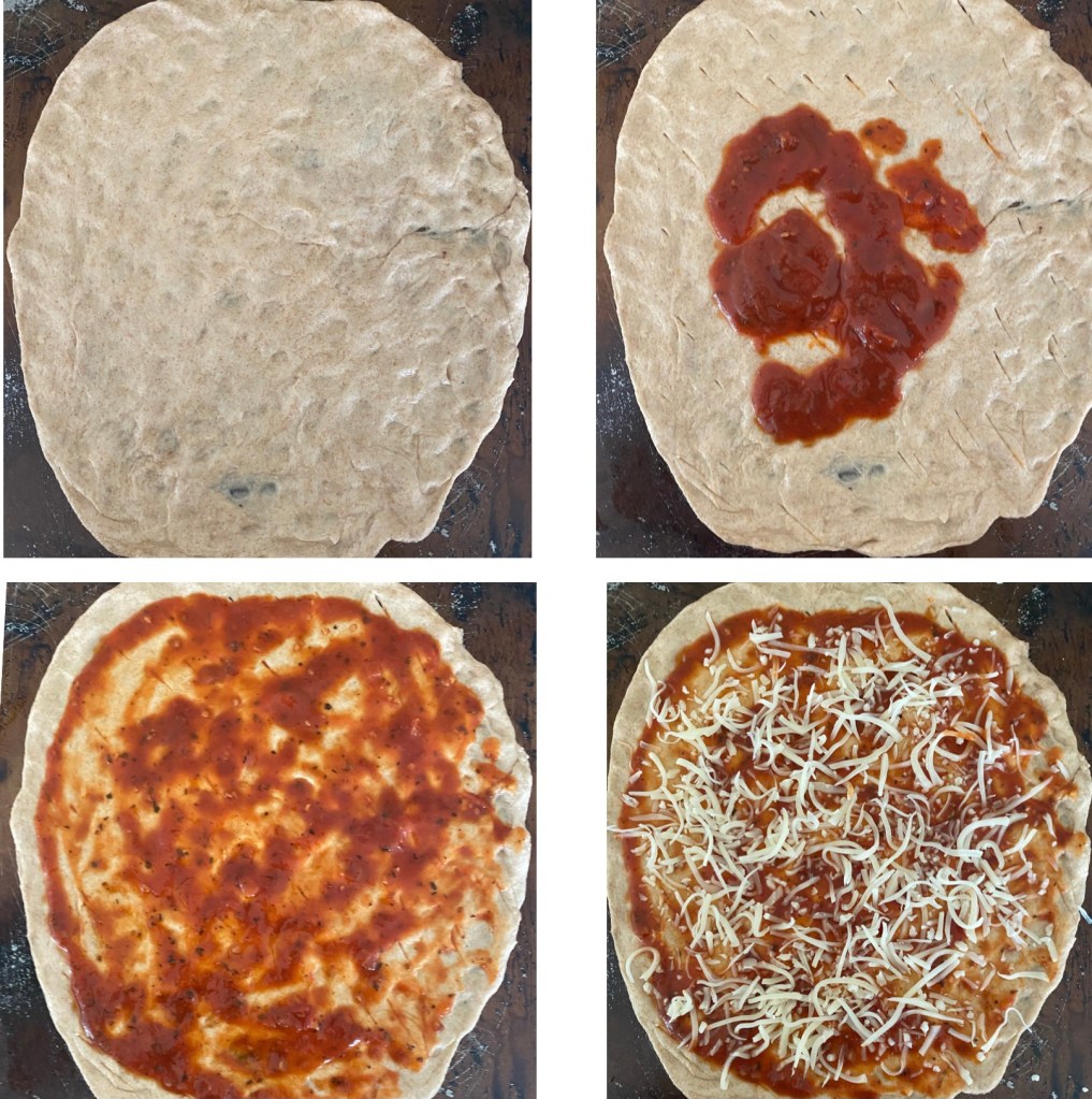 - Use a little bit of olive oil to spread it thin. Pierce the crust with a sharp knife all over so the dough doesn’t ballon up when you’re cooking the pizza.