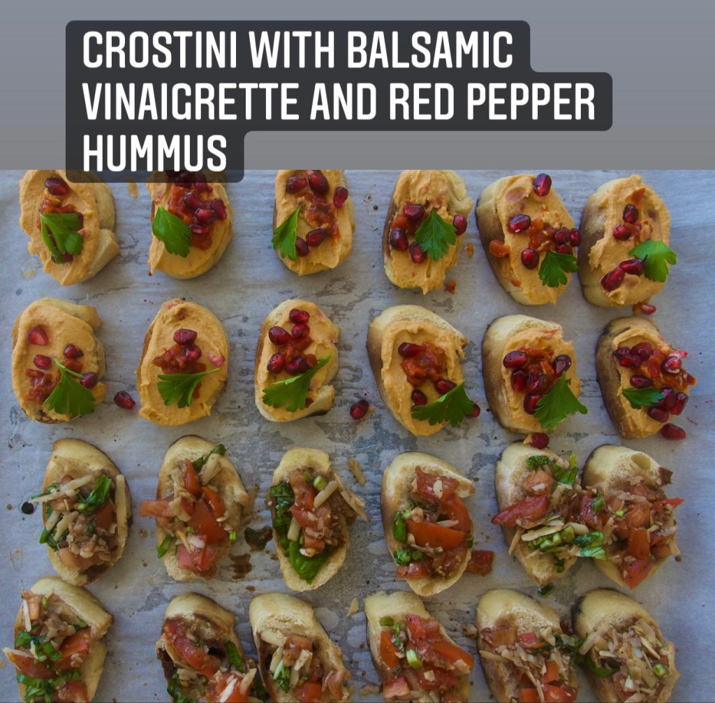 *Crostini with Red Pepper Hummus and Balsamic Basil Vinaigrette
