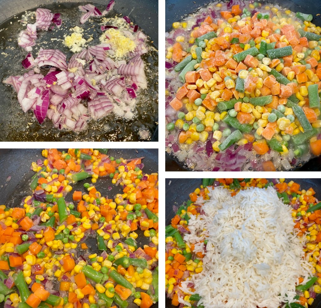 - Add mixed vegetables, ginger and a little salt. Cook for a couple of minutes on high heat.