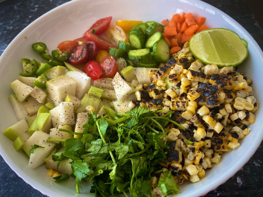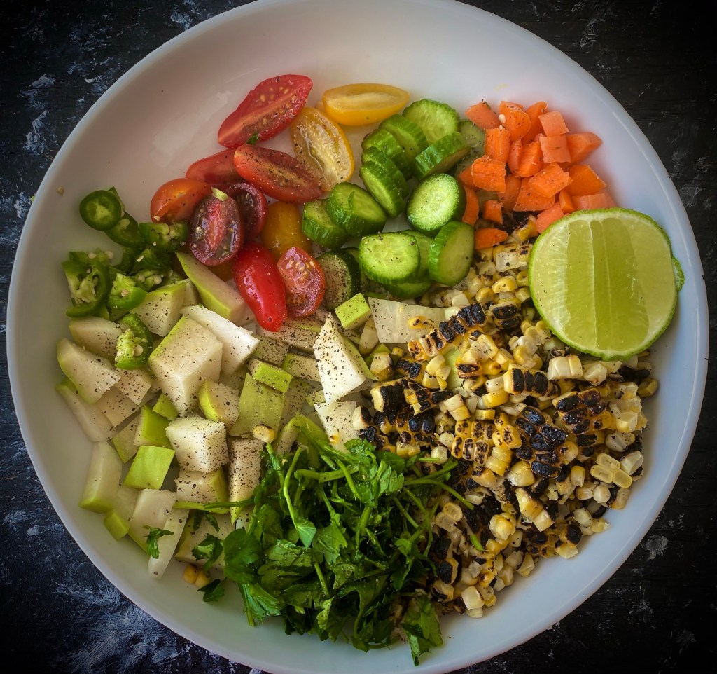 If you haven’t had a chayote before, it tastes a bit like a cross between a guava and a pear. But it is not as sour as a guava and neither is it as sweet as a pear. It is a bit bland and has a tad bitterness to it. It’s crunchy and can be eaten raw, cooked, mashed, grilled to name a few ways. The addition of charred corn adds that smokiness and paired with fresh herbs with the sour of lemon, a hint of spiciness with the peppers, it is a refreshing dish. Serve either on its own or with grilled fish or chicken. Use it in a burrito next time! @sarchakra