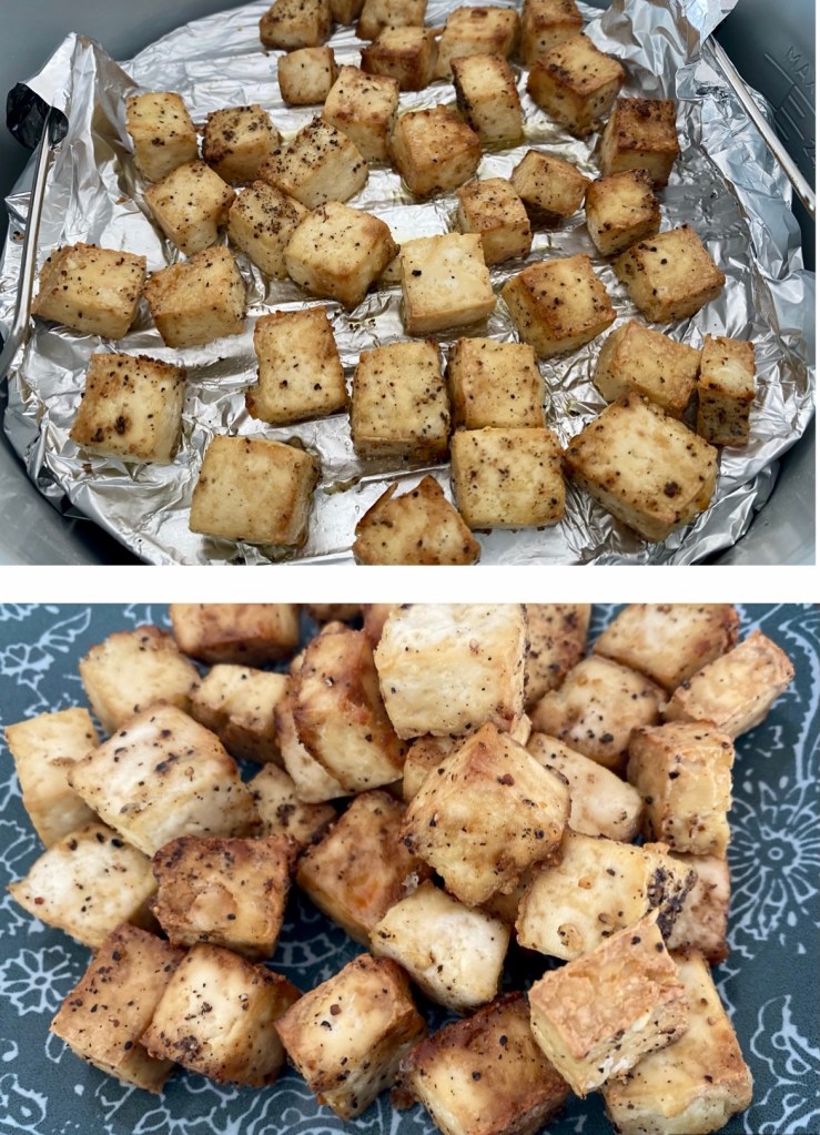 - Place the tofu cubes on the lined tray. Close the crisping lid. Select AIR CRISP. Set the TEMPERATURE to 400°F, set the time to 20 mins. Select START. After 10 mins flip the tofu cubes and cook the other side for the rest of the time.