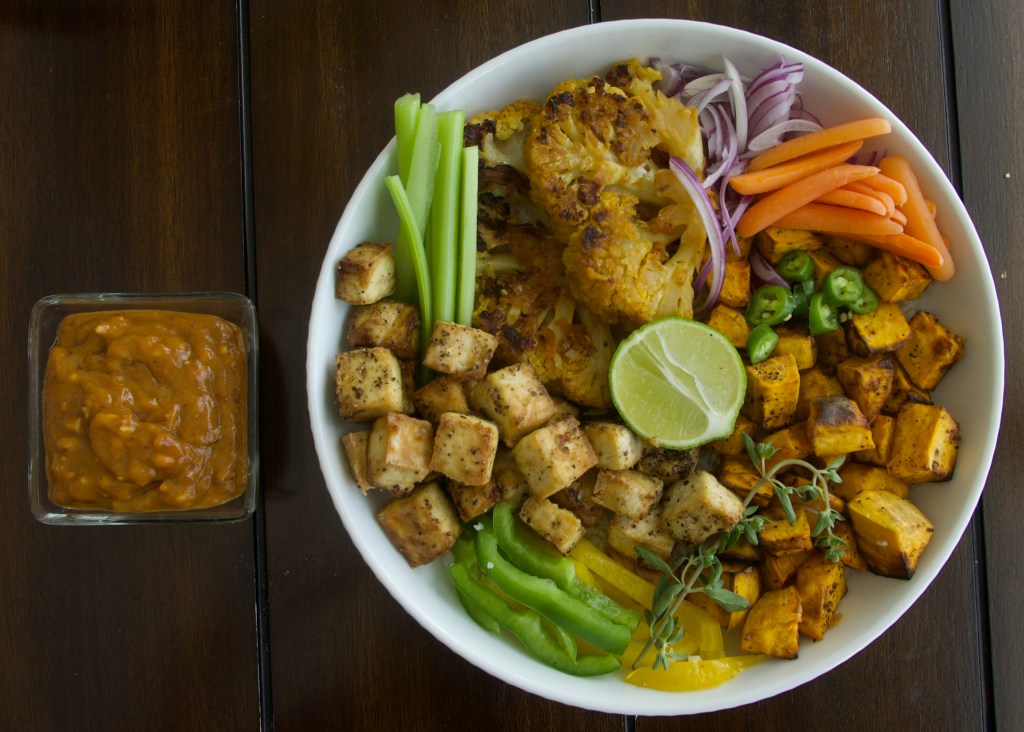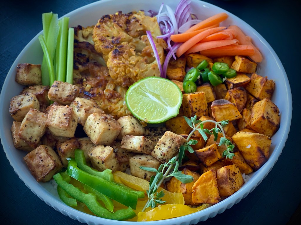 - Arrange sliced carrots, celery, carrots, green pepper, yellow pepper, onion, roasted sweet potatoes, cauliflower steaks, crispy tofu and poblano chili slices.