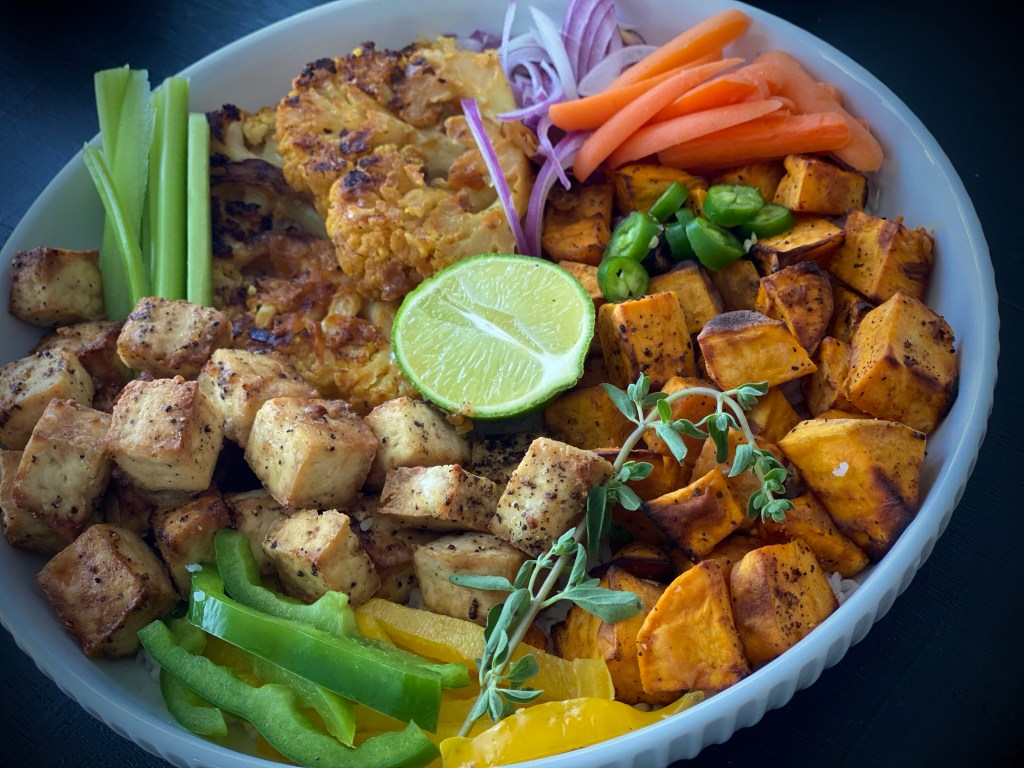A Buddha bowl with crispy tofu, cauliflower steaks, sweet potatoes and a ton of vegetables on a bed of basmati rice is not only healthy, it is equally delicious. Part of this recipe is made with the Ninja Foodie. I’ve added a couple of links to the recipes. The cauliflower steaks can most definitely be cooked in the air fryer too. This recipe does require some prep and time compared to most of my other recipes but once you get started it is not that hard honestly, you gotta trust me. It is so delicious, you’d want to make it again and again. This is a great way to eat more veggies and incorporate healthy eating habits into your daily life. Serve this Buddha Bowl with the 4 ingredient dressing or eat as is @sarchakra