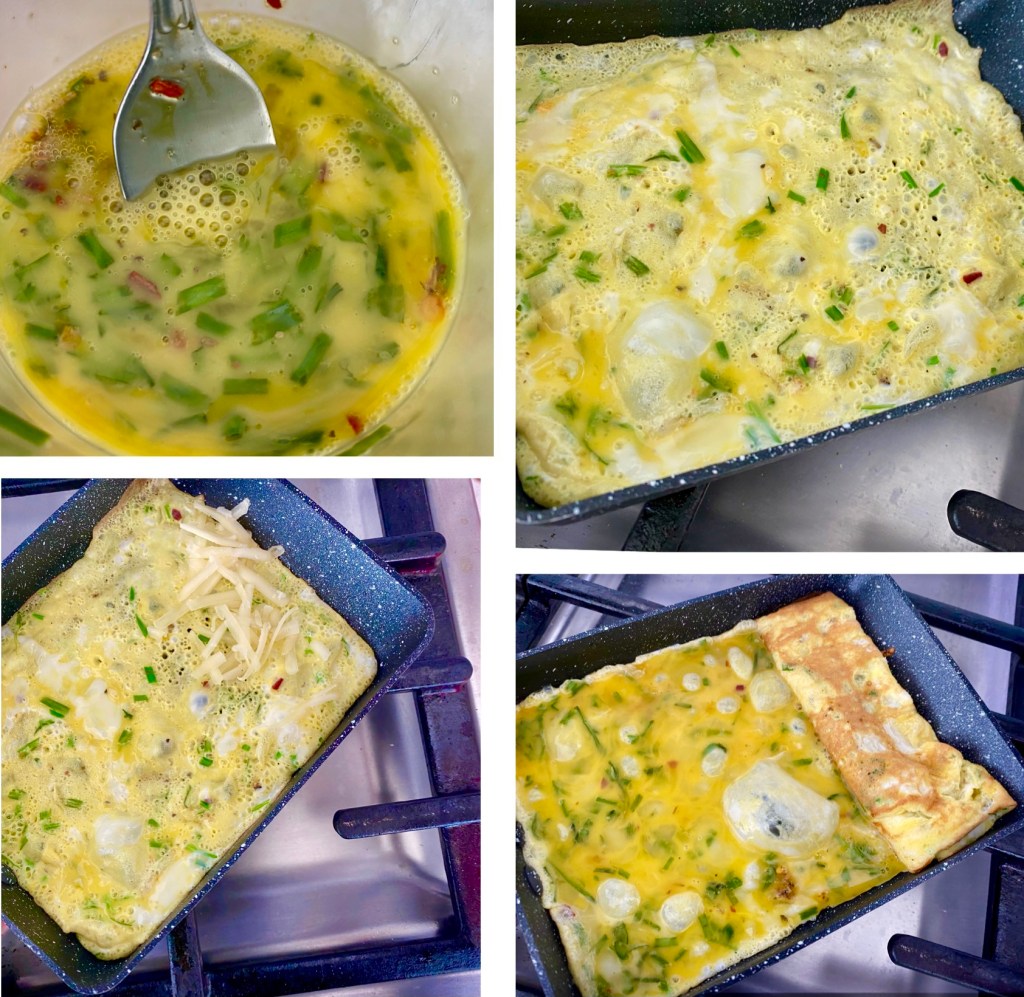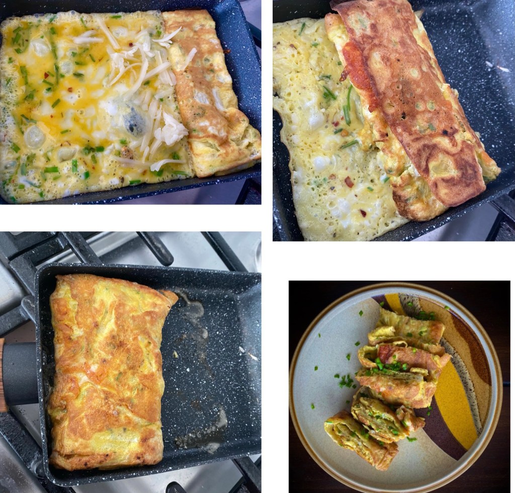 - Brush tomagoyaki pan with a little oil. Add ⅓ of the egg mixture. Tilt pan and let the egg spread out. Put some white cheddar in. Use chopsticks to roll and move the cooked egg to one side. Pour in 1/3 of the egg mixture. Put in some cheddar. Cook again. Repeat the process. Then add the last portion of egg along with the cheddar cheese.