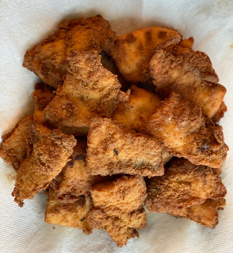 - Heat oil. Keep oil to medium heat. Fry 4-5 pieces at a time. Drain on kitchen towels.