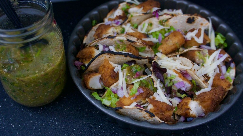 - Put in chopped lettuce, onion, fried fish and salsa verde.
