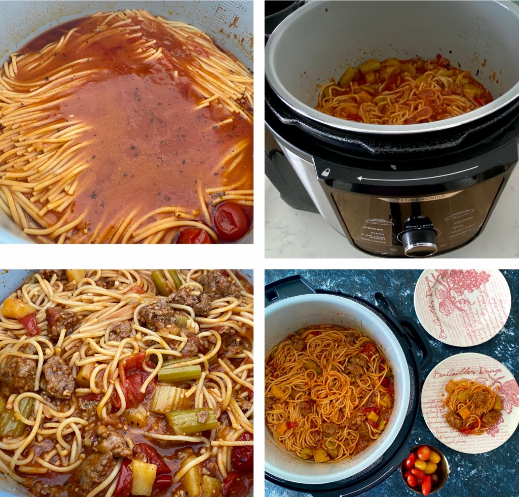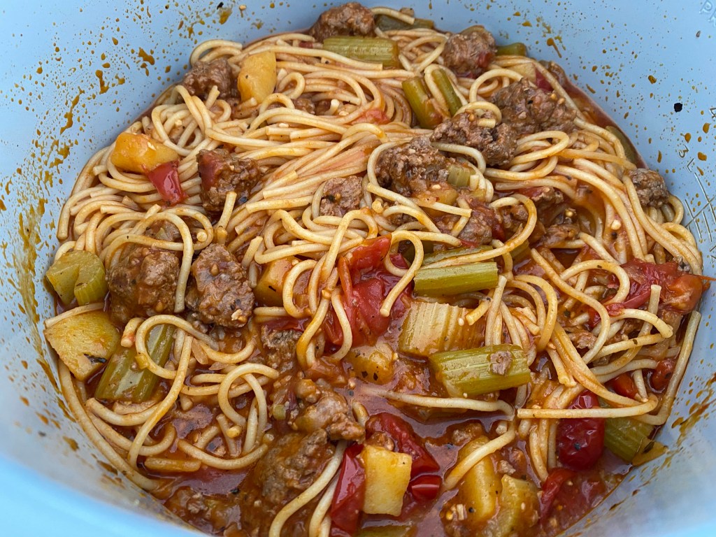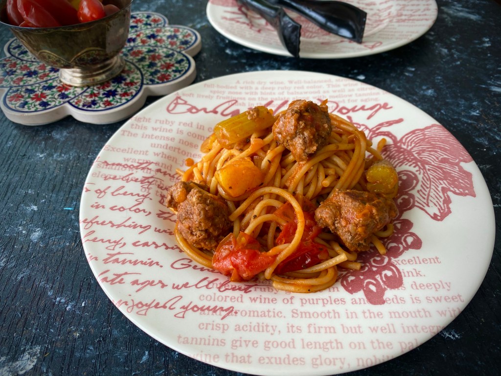 The idea for the recipe came from the very talented blogger The Salted Pepper who cooked spaghetti in the ninja foodie. When I read that article I was surprised it worked considering the ‘starch’ factor in pasta but I was eager to try it out. What do you know! It works beautifully. I changed the recipe slightly as I don’t eat beef and I thought the combination of ground lamb would work really well with celery and potatoes. The fun part was that the lamb formed into ‘balls’ on their own like a linguine meatball dish which was brilliant.