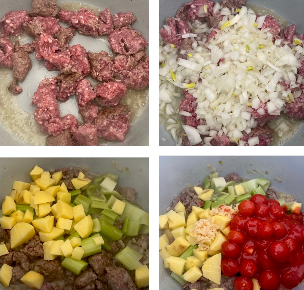 - Set the Ninja Foodie FUNCTION to SAUTÉ. Heat oil. Put in ground lamb. Cook for a couple of minutes till it starts to brown. Separate the meat gently with a wooden ladle.
