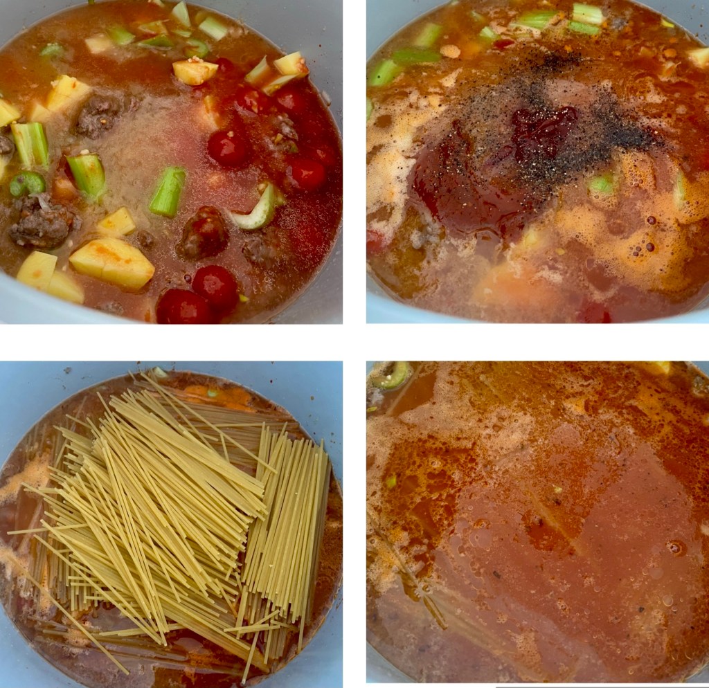 - Add in chopped potatoes and celery. Pour in a can of cherry tomatoes. Add garlic. Put in black pepper powder and tomato ketchup.
