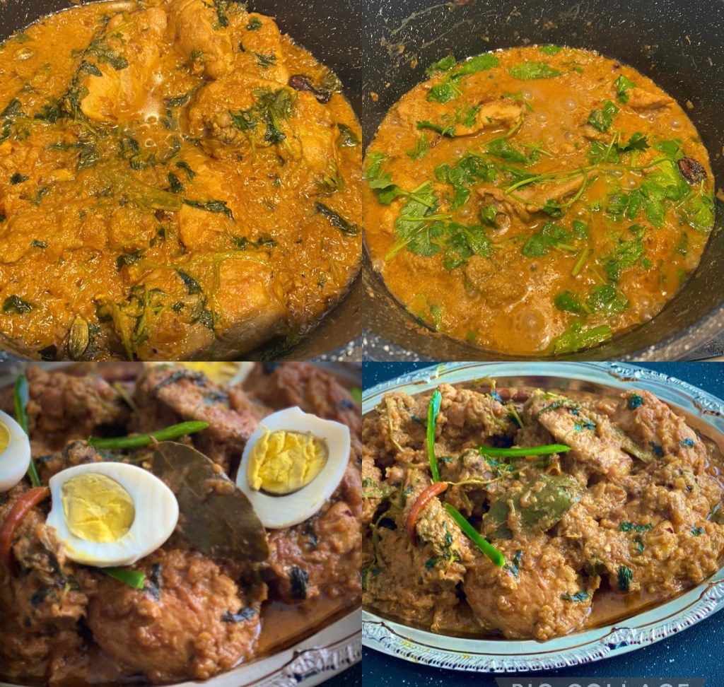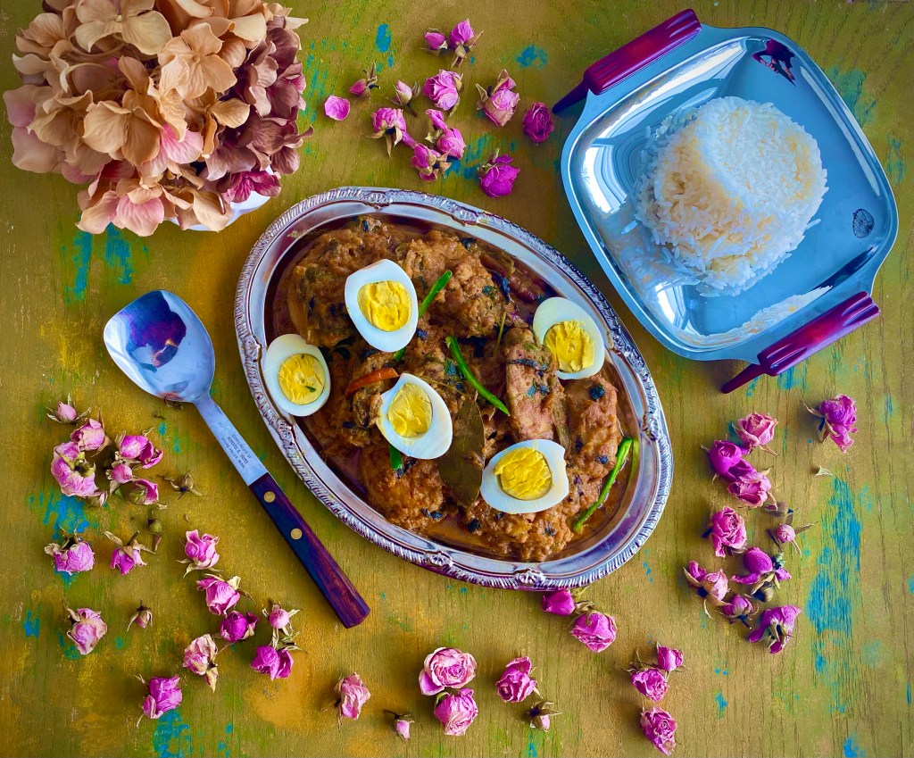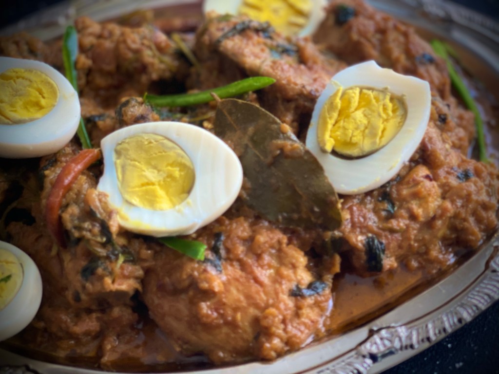 Bhopali cuisine is wonderfully rustic. It is not as subtle and refined as Lucknowi cuisine with its use of dairy products and use of aromatics but nor is it as bold as Hyderabadi cuisine with its use of coconut, tamarind and red chilies. Bhopal has a culinary nawabi tradition dating back several centuries. The three main dishes from the Nawaabi kitchens of Bhopal are Gosht Pasinda, Bhopali Rezala and the Filfora. Today’s recipe, Bhopali Murgh Rezala originated in the royal kitchens of Bhopal. The dish is native to the capital of Madhya Pradesh, the state known as the heart of India, with its rich culture and history as well as a vibrant cuisine. Made by Nawabi chefs, this Rezala is different from the Kolkata or Bangladeshi Style Rezala which is a rich and heavy white gravy with cream and cashews. Shah Jahan Begum loved colors and would host festivals like ‘jashn-e-hariyali’ where the people wore green, the decor was green and all the dishes were also green! Large amounts of coriander leaf (kothmir or dhaniya) is a defining feature of Bhopali food. The final dish is then garnished with boiled and peeled eggs @sarchakra