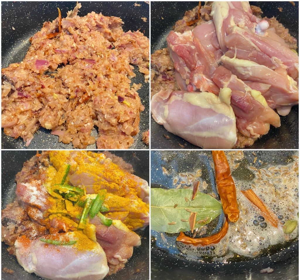 - Heat oil. add bay leaf, black cardamom, green cardamom, cinnamon, cumin seeds and dry red chilies. Cook for a few seconds.
