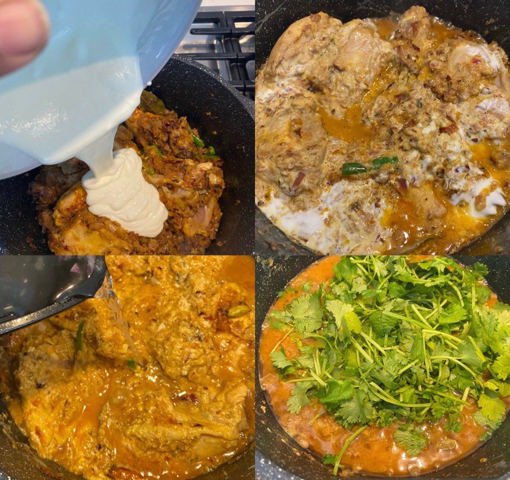 - Beat yogurt and pour into the chicken. Cook covered for 10 mins. Then add a cup of water. Cover again and cook till the chicken is nearly done.