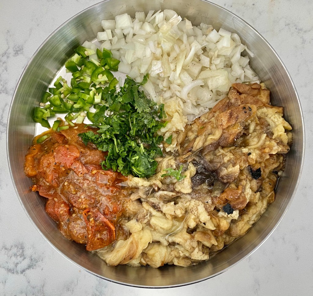 - In a bowl assemble together the mashed eggplant, the crushed blistered tomatoes, salt, chopped onion, chilies, chopped coriander and oil.