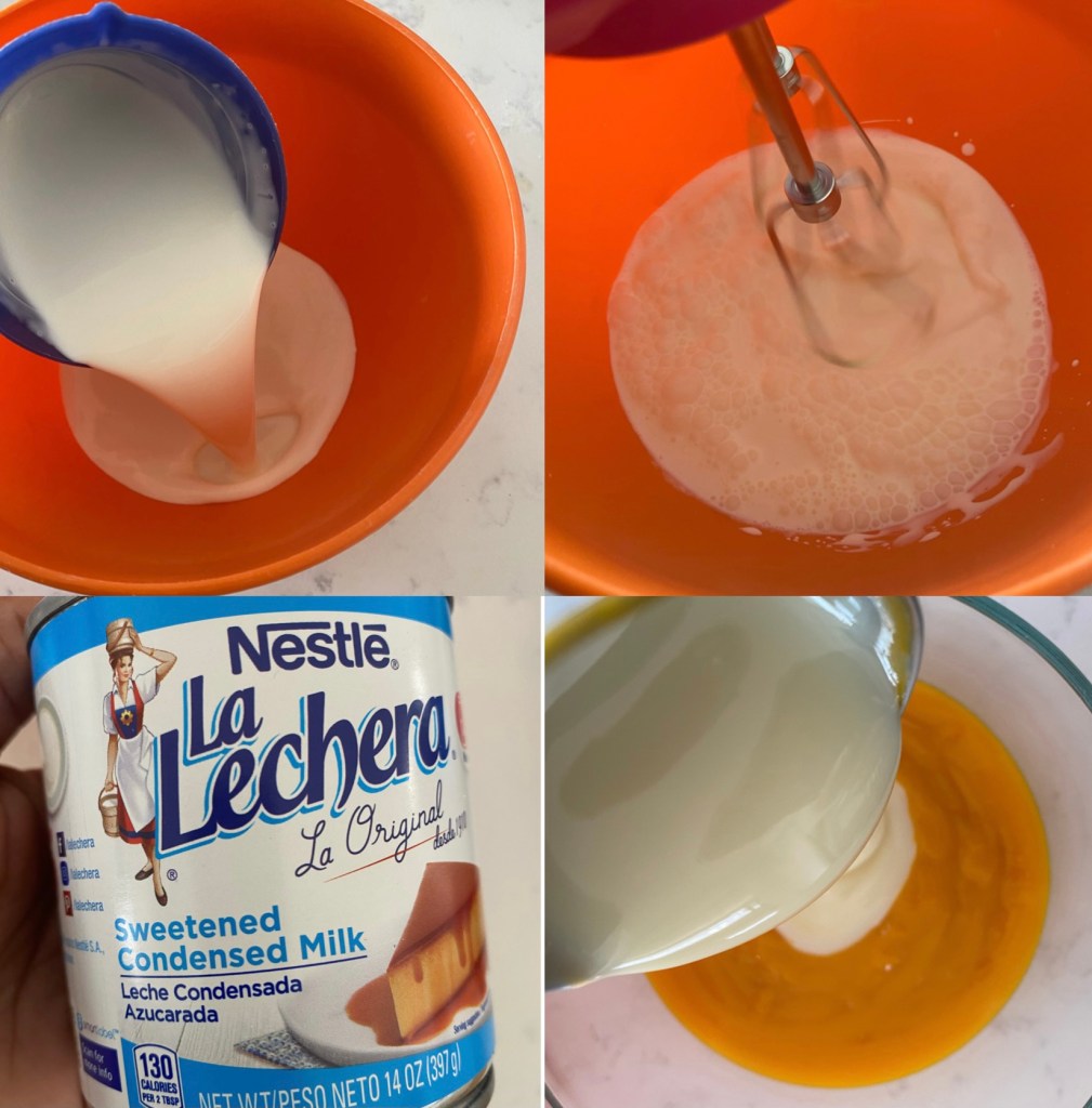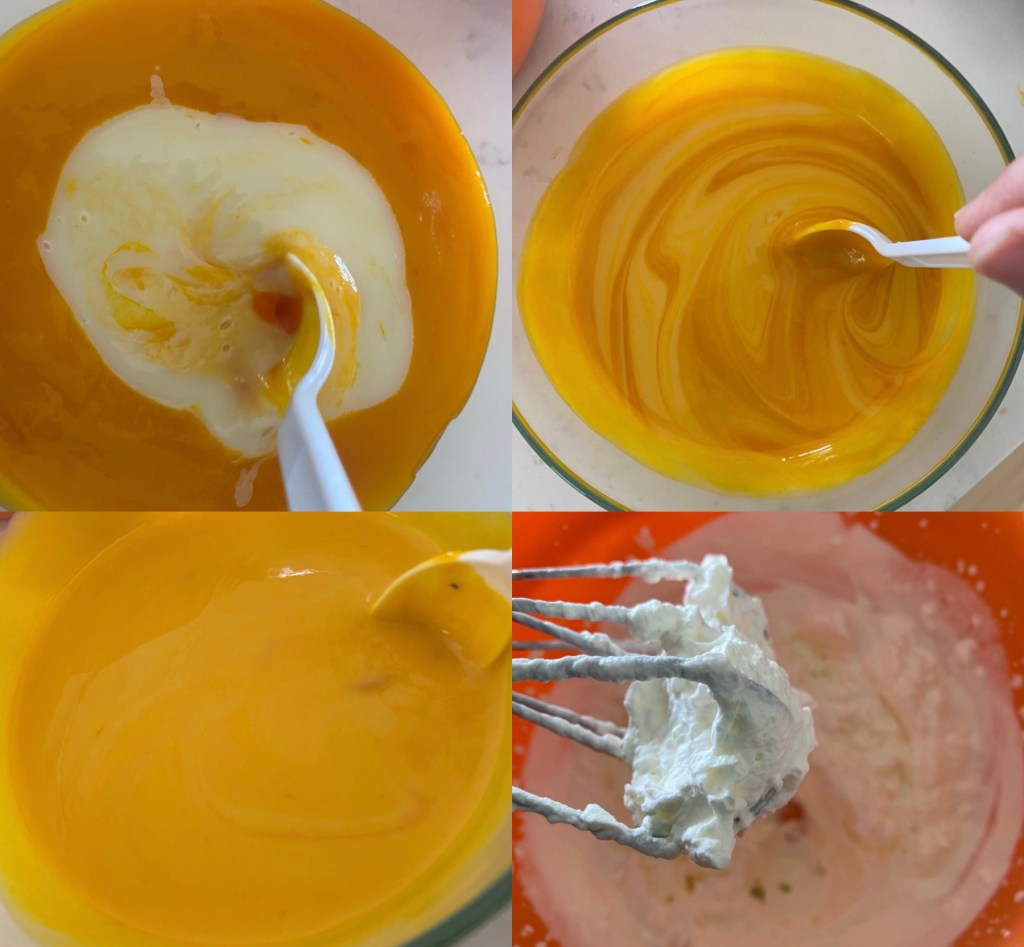 • In a bowl mix together mango purée, condensed milk and yellow coloring. Keep aside.