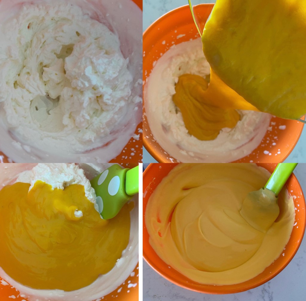 • Pour the mango purée mixture into the whipped cream. Use a spatula to gently fold the mixture together till smooth.