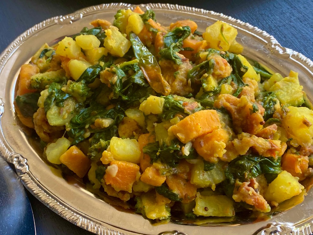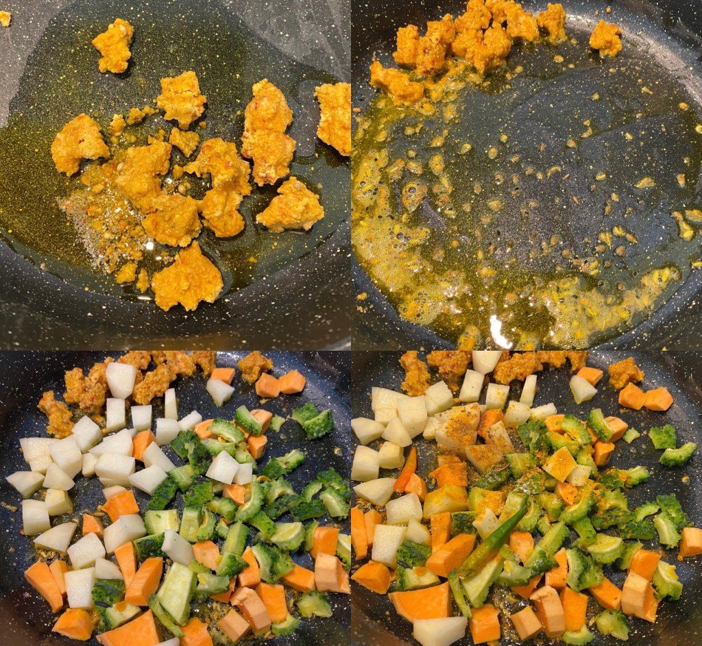 - Add chopped bitter gourd, sweet potato and potato. Season with salt, turmeric and cumin powder. Add green chilies.