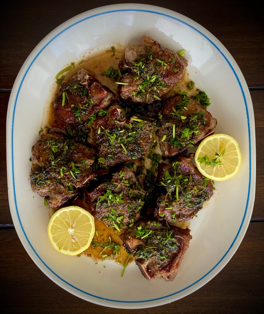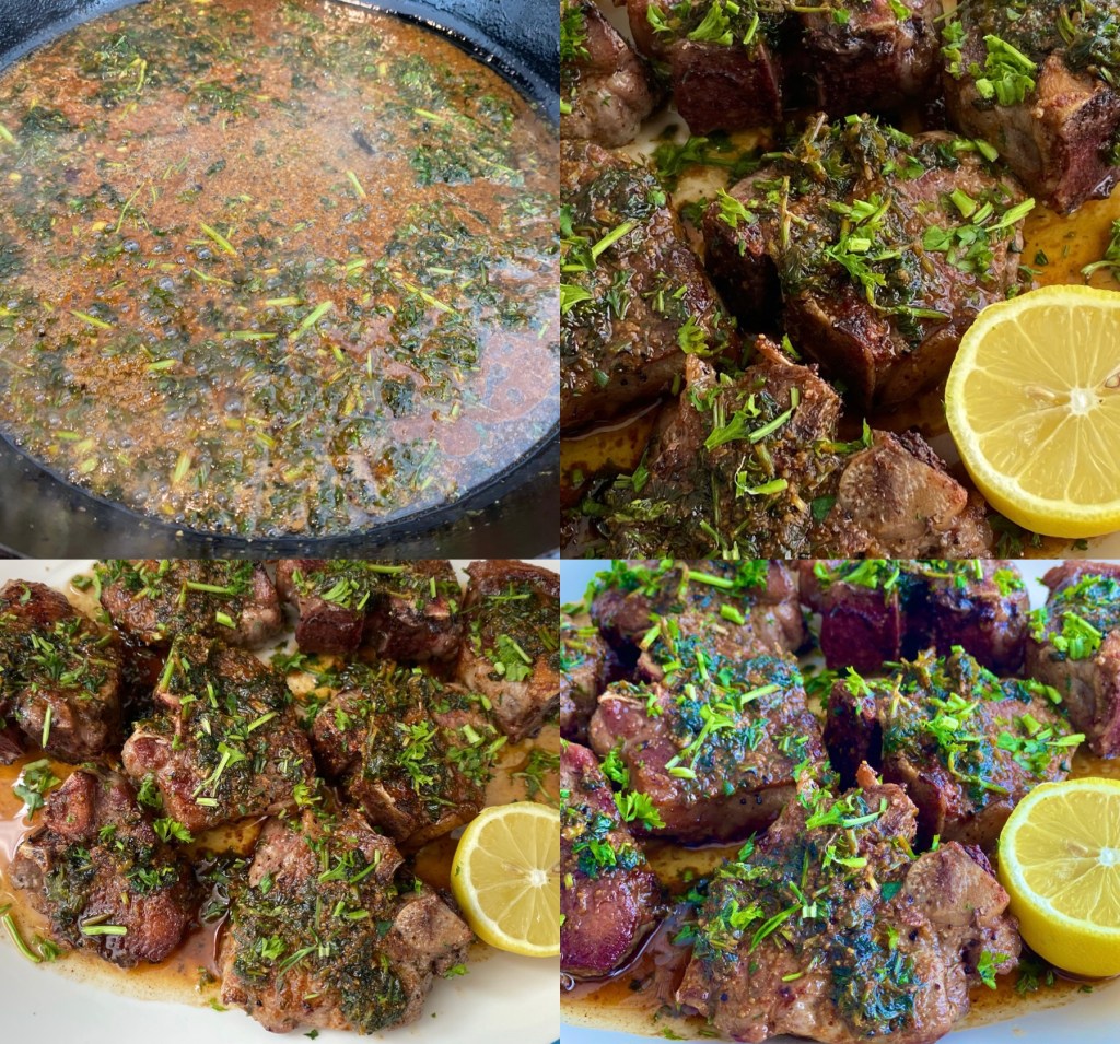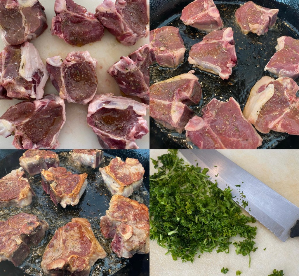 - Add the butter. Put in lemon juice, butter, chopped parsley. Scrape up any browned bits of the lamb stuck to the bottom. Cook for an extra minute. Turn off the heat.