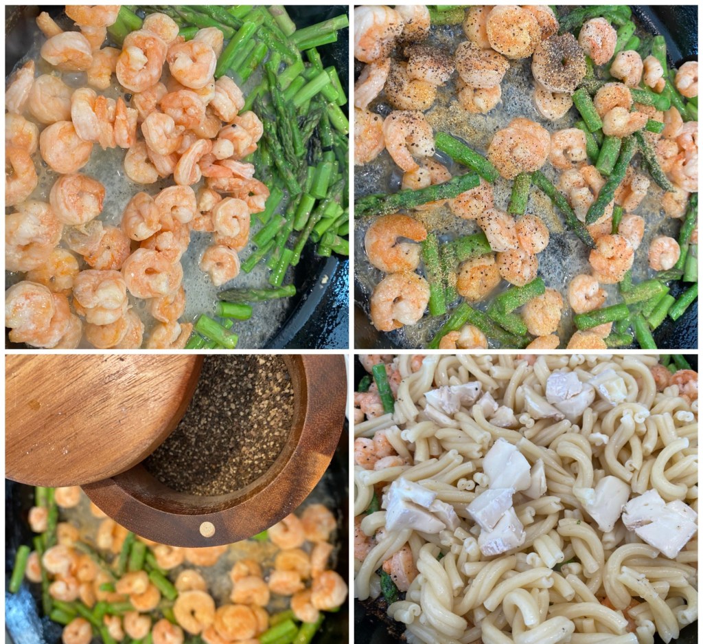 - Heat olive oil. Sauté asparagus. Add shrimp. Cook till pink. Season with salt and pepper.
