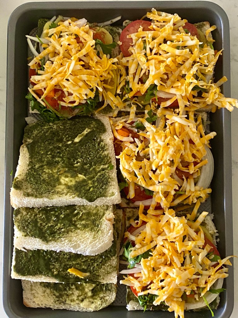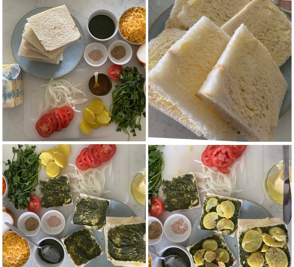 - Trim the bread slices from all sides . Apply butter on all the slices. Spread a generous layer of the chutney on each slice.