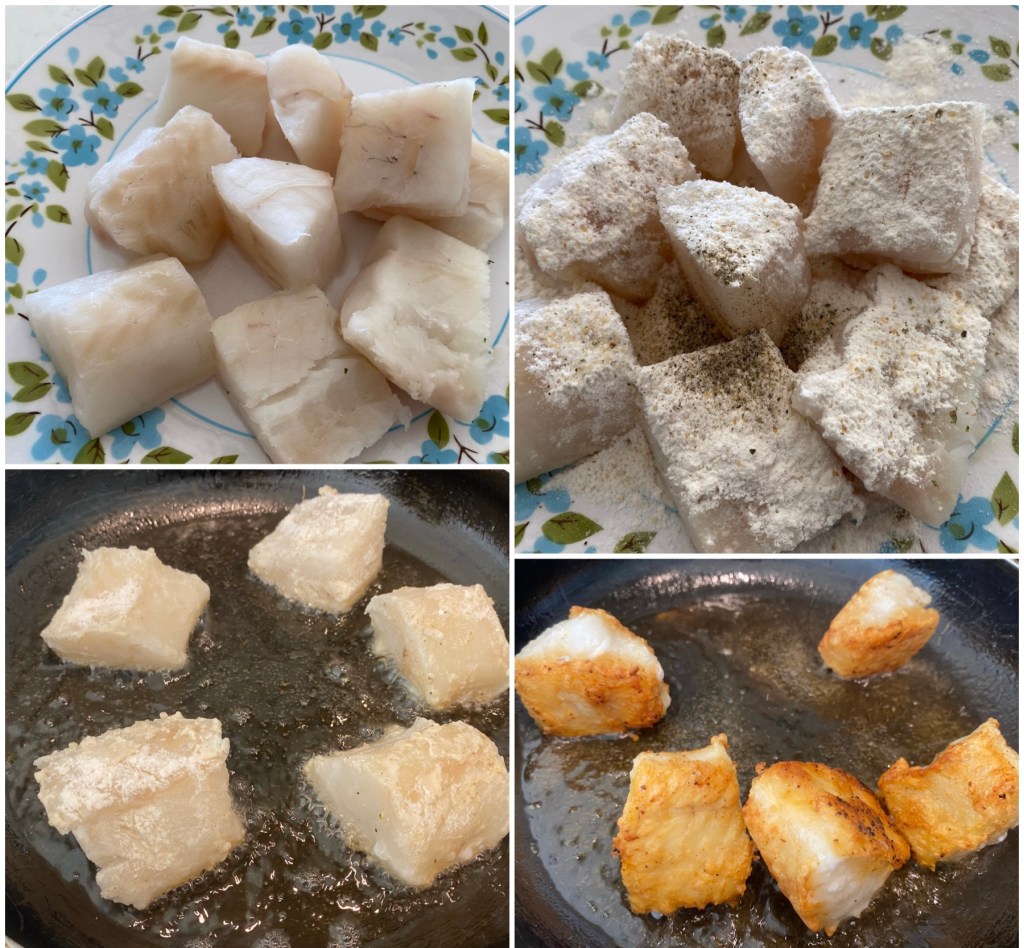 - Cut cod in thick pieces. Rub salt, pepper and all purpose flour on the fish.