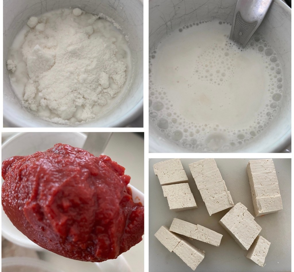 • Heat a cup of water in the microwave for a minute add the coconut powder in the water. Add the tomato paste in the water. Stir the mixture till smooth. Keep aside.