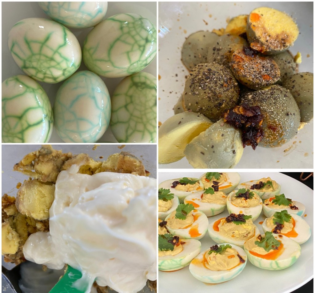 - Hard boiled the egg. Crack the eggs slightly. In a bowl add the food color and water. Submerge the eggs and refrigerate for at least a couple of hours. Shell the eggs.