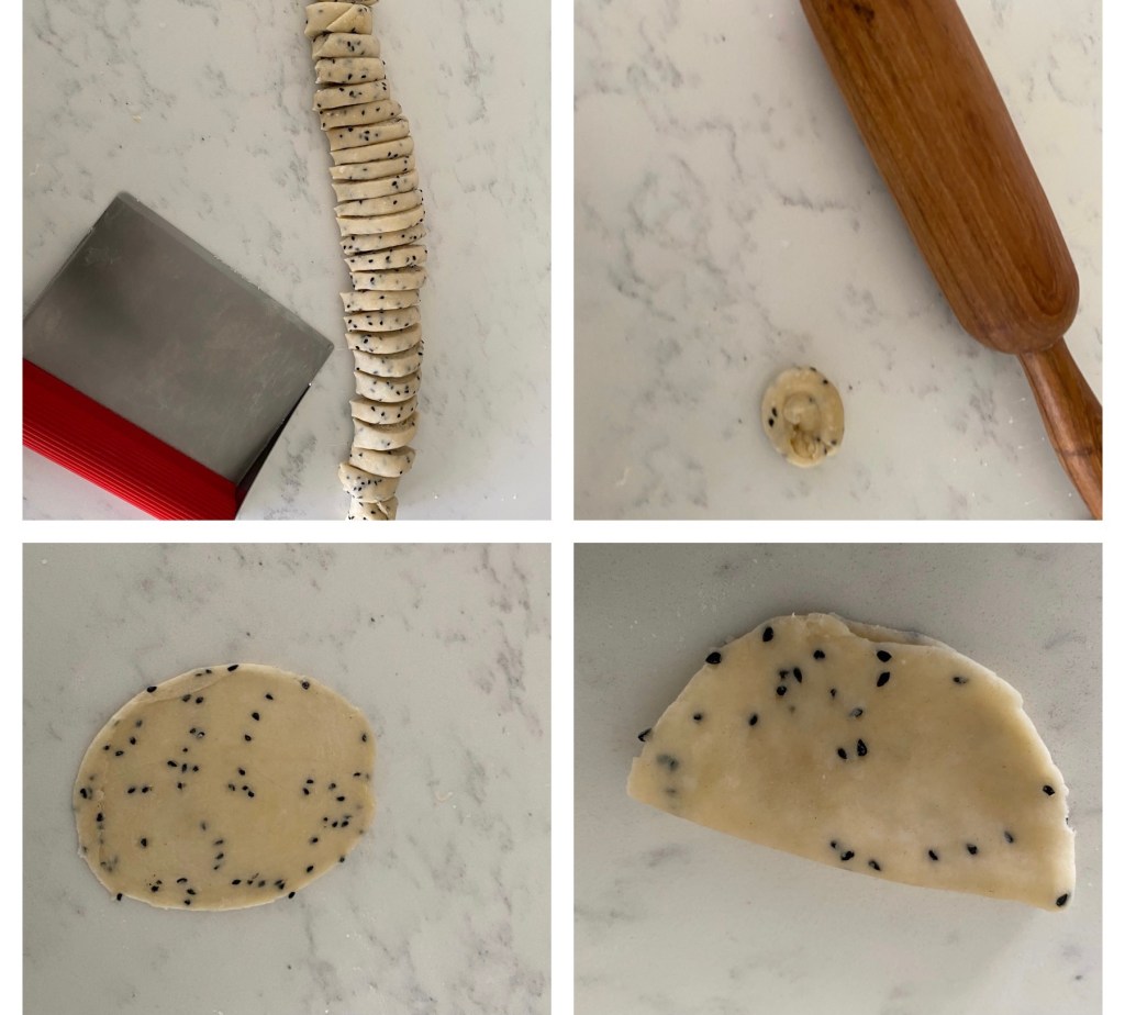 - Roll the dough into a large thin round. Roll the dough from one side. Use the flour paste to close the ends.