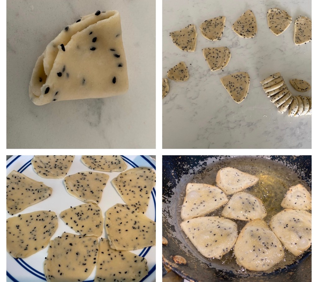 - Take a ball and flatten it with a rolling pin. Fold the circle in half and then fold again. Roll the triangular shaped dough thin. Repeat for the rest.