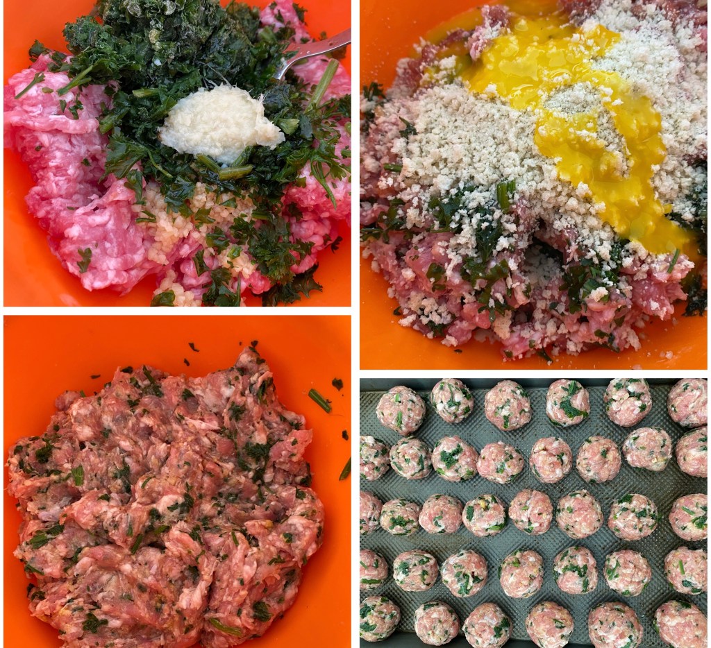 - Use a tbsp to measure out equal portions of meatballs from the pork mixture.