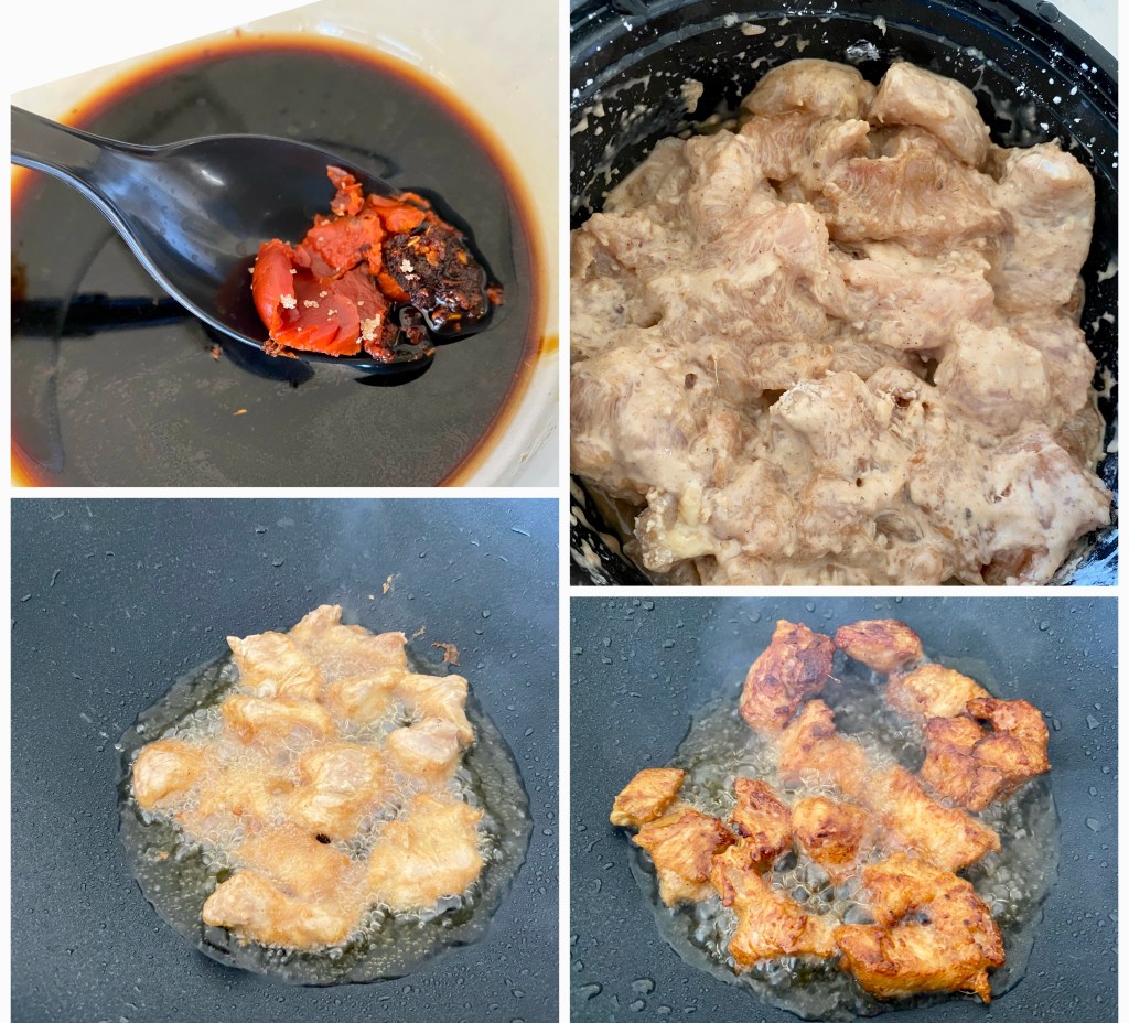 - While the chicken is frying in a small bowl add 1 tbsp light soy sauce, 1 tsp white pepper, vinegar, dark soy sauce, brown sugar and tomato ketchup.