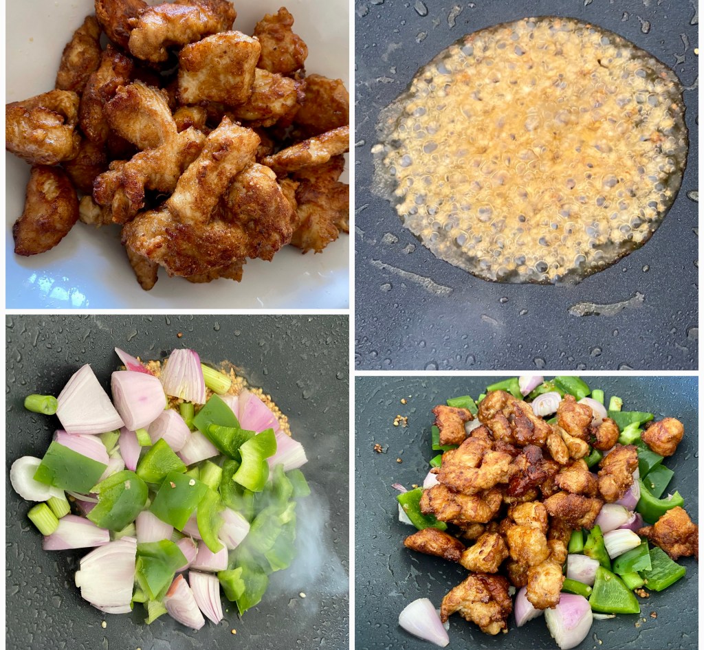 - Heat oil. Fry the chicken pieces in batches till golden. Keep aside.