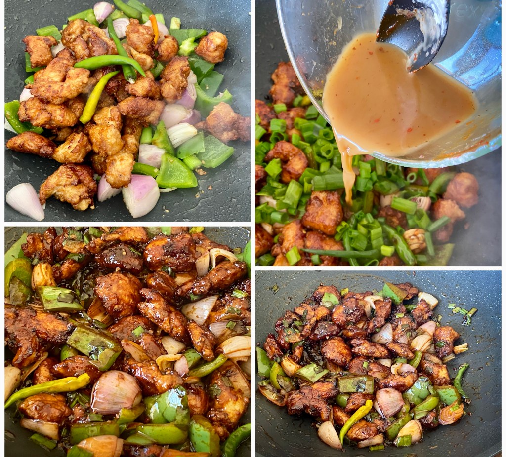 - Cook for a couple of minutes till the sauce coats the chicken. Add the green onion tops and stir once more. Chili Chicken is ready.